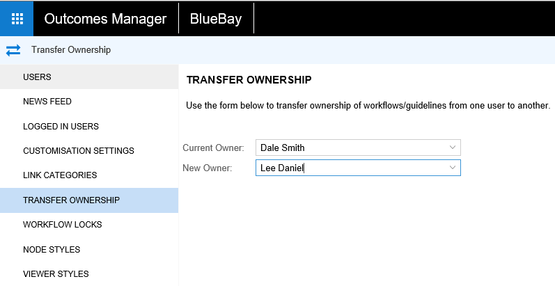 Transfer ownership is used to transfer Workflows and Guidelines form one user to another.