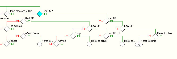 In the image above the Over 65? Rule Node will generate an alert from the Reject branch to refer a patient to a clinic, if they meet the following criteria: