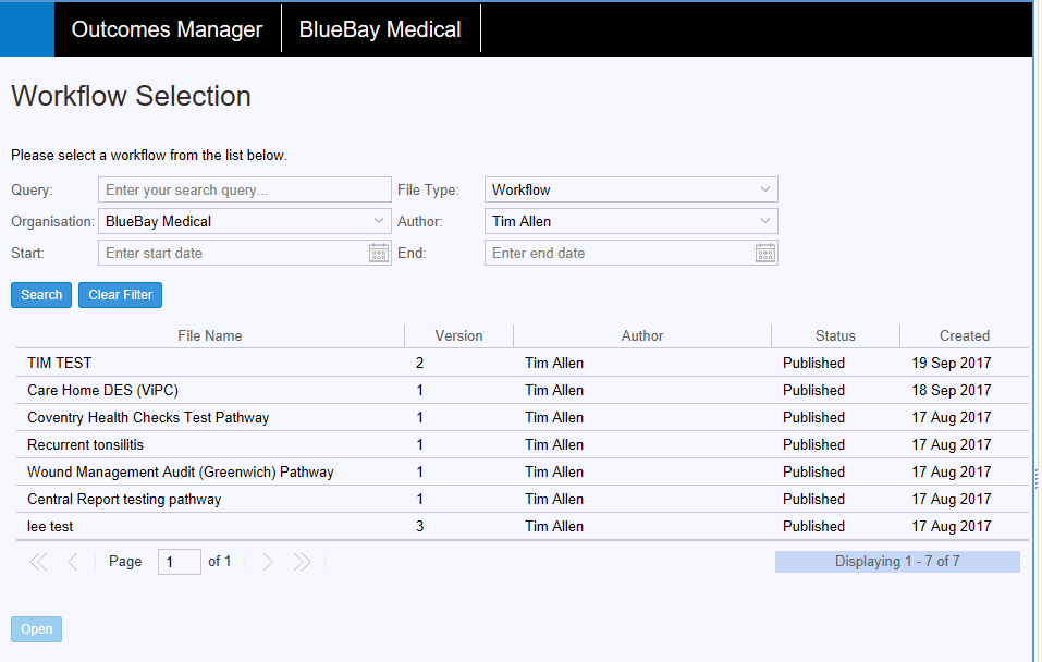 • Select a Workflow and click Open (Your workflow must have been published for it to be visible)