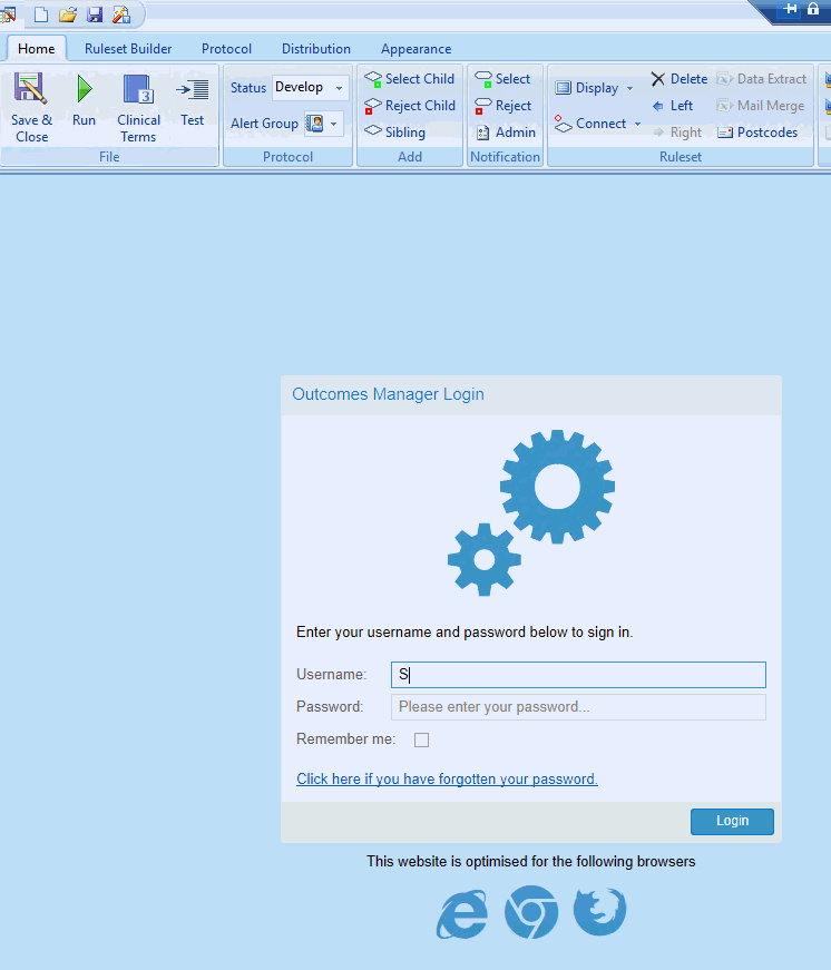 • In the Pathway Developer environment, log out of Outcomes Manager (Keep Pathway Developer running). This is because you are required to re-login to Outcomes Manager when Workflows are to be linked.