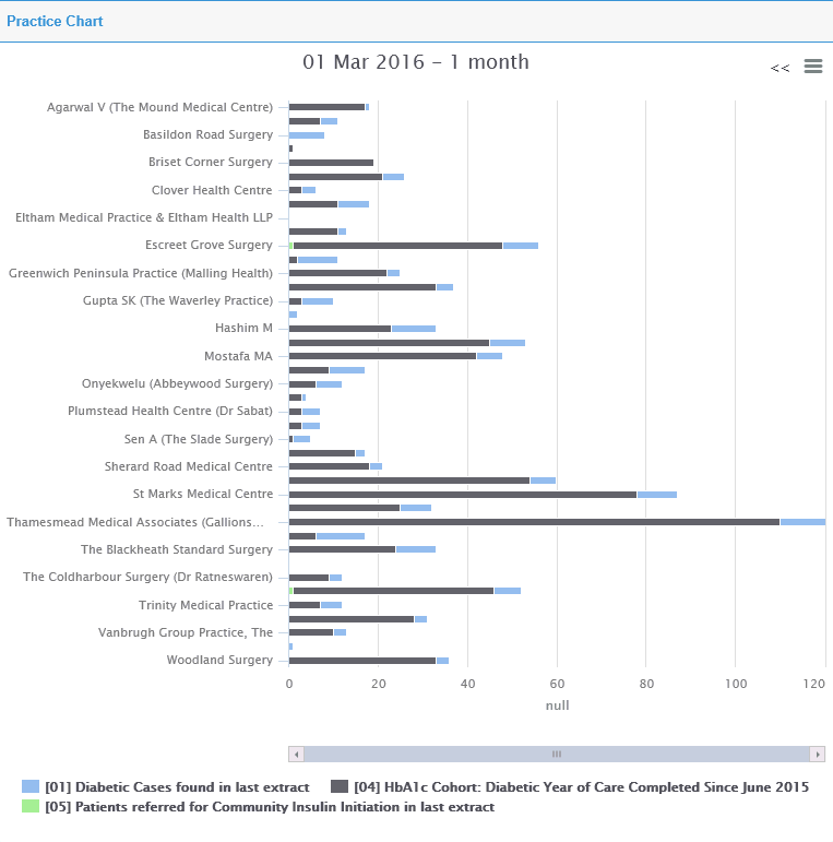 A Drill Down chart can display summaries of activity across practices and date ranges. When a user clicks on elements of the summary chart this will then drill down into the practice data making up that summary.