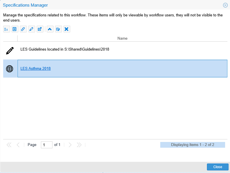 Specifications Manager is a section within Workflow that allows Workflow Owners to attach material pertinent to the design of their Workflow. This material is not visible to end users viewing the published workflow.