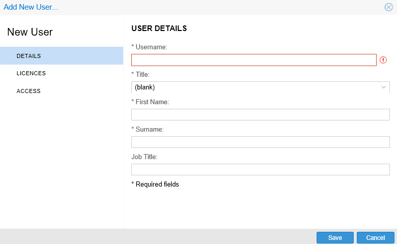 Click the Add User option which then generates the NEW User pop up screen.