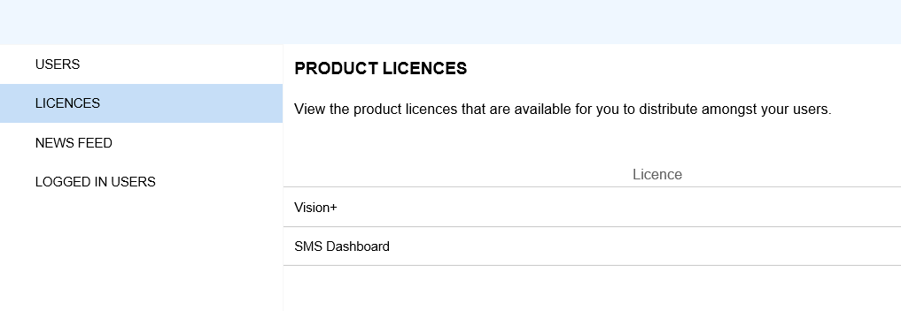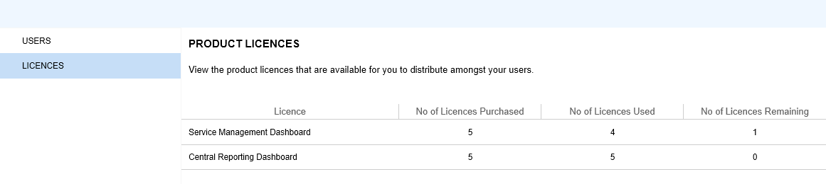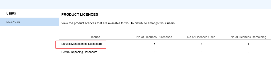 An active user of a Dashboard tile must be associated with a licence. Licences control access to the following Dashboards. (A single user can have multiple licences)