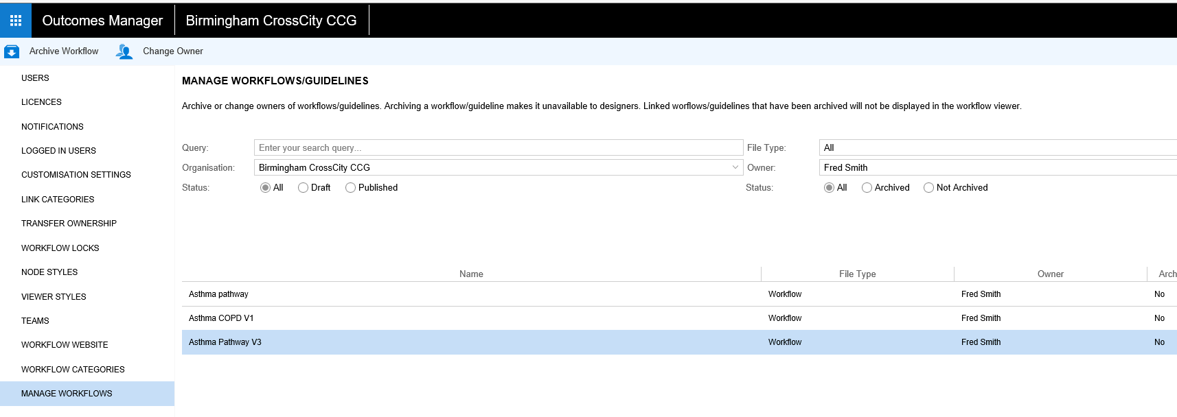 Workflows\Guidelines can be archived making them unavailable to be opened and edited. Workflows can be transferred between authors.