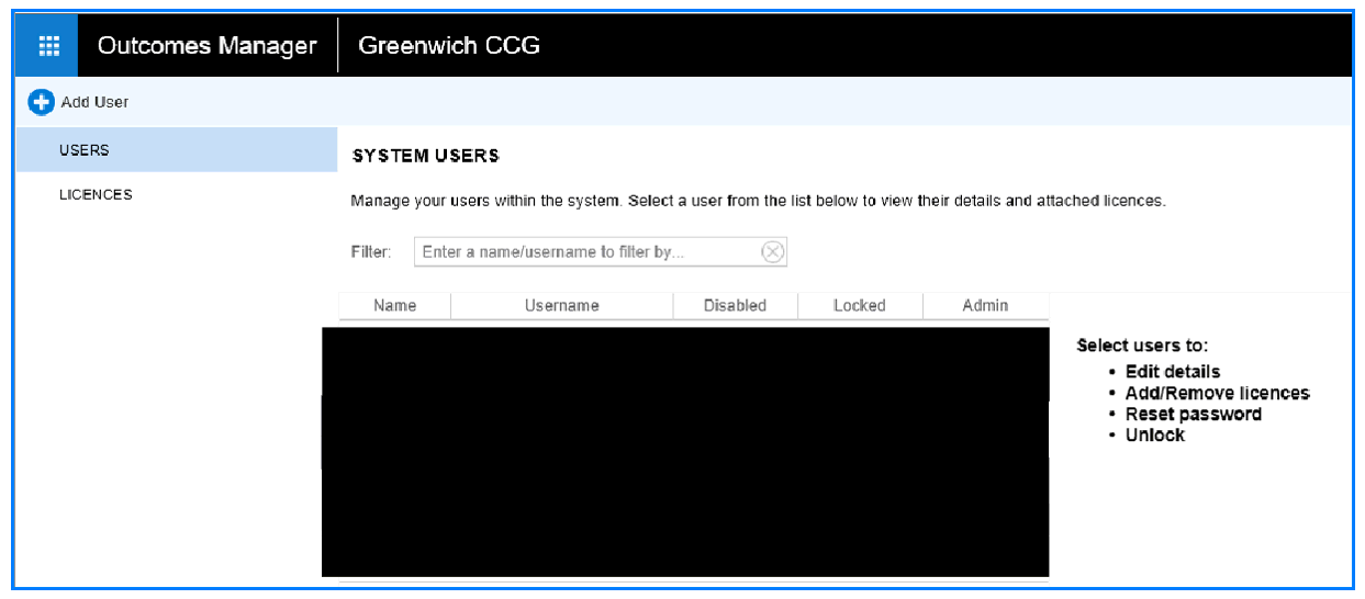 Any user details that were provided during the configuration phase of your Outcomes Manager will be visible. As an administrator this list can now be managed within your organisation.
