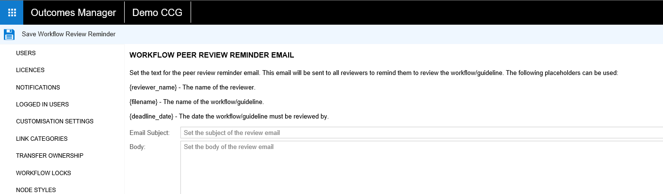 The Workflow Reminder email is a template that can be used to send messages to peer reviewers to inform them they have reviews outstanding.