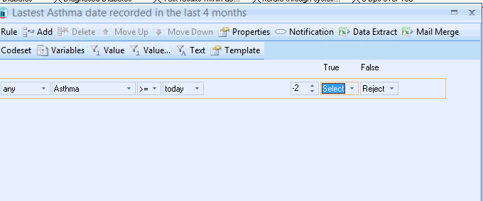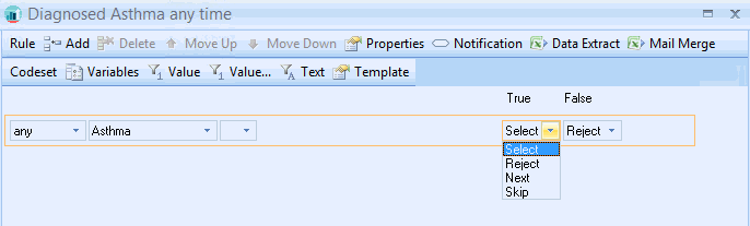 or False. A Rule Node must finish with a Select or Reject statement contained in a Rule Line. The Rule line can contain the Select\ Reject in either the True or False position. A True or False result can have the following Outcomes below: |