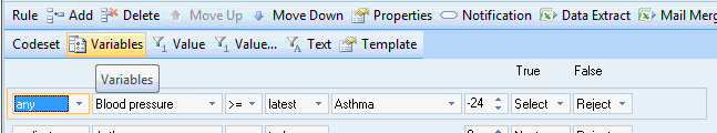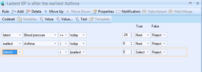 If a date from the Blood pressure codeset exists it will be stored in the [latest] variable. Any date that exists from the Asthma codeset will be stored in the [earliest] variable.