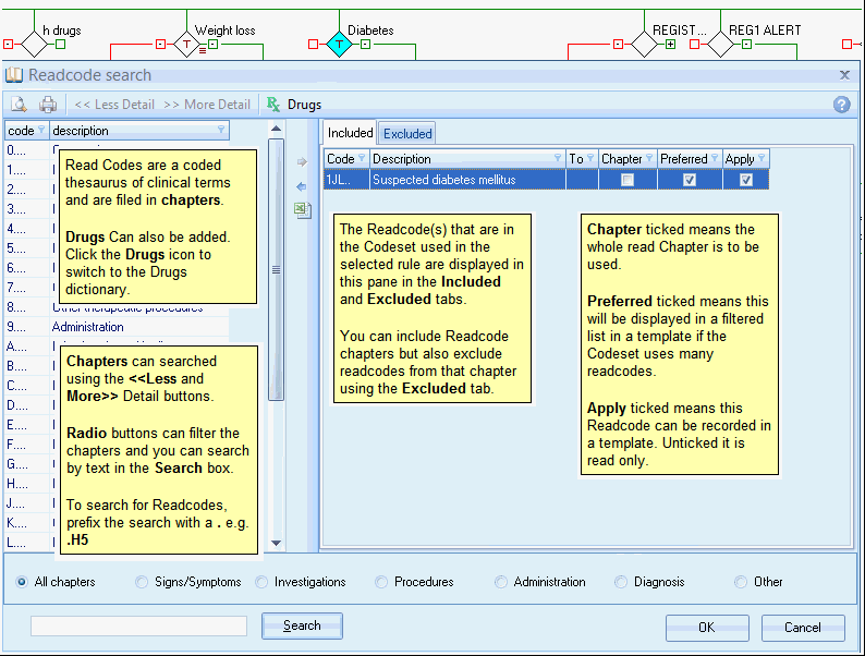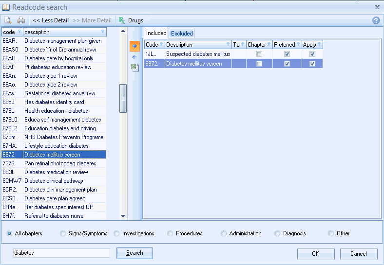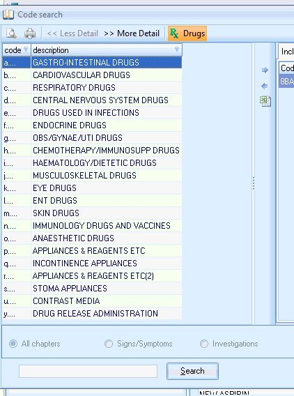 • Search for the Readcode using the Search buttons\ Radio Buttons and\ or the Search entry box.