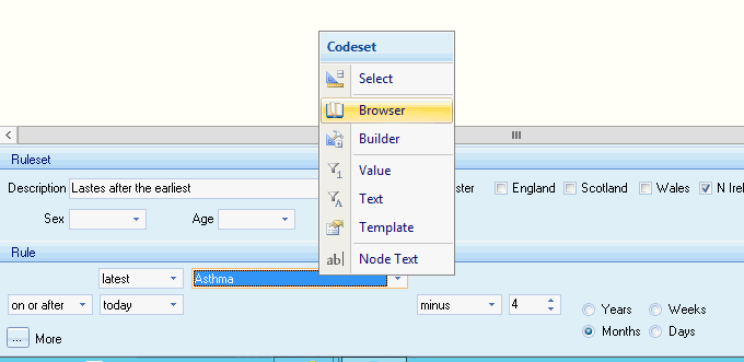 • Select a Rule Node in your pathway and click on the Browser icon. This will open the Readcode search (CTV or Snomed ) screen.