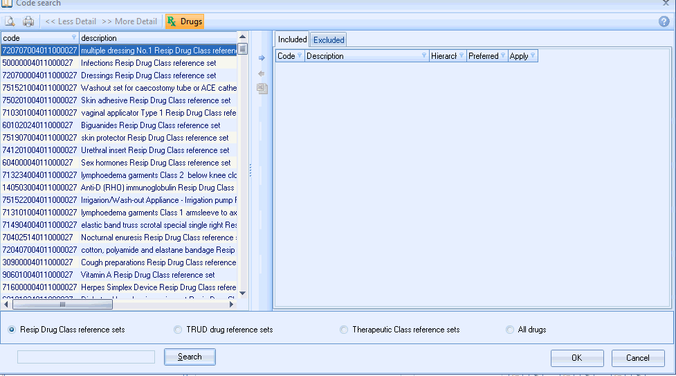 The Drug Search screen operates in the same way as the Clinical codes and users reference sets these will also be updated on a monthly basis.