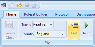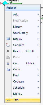 • Click on the Test icon on the Home Tab or Right mouse click and select Test from the Ruleset inline menu.
