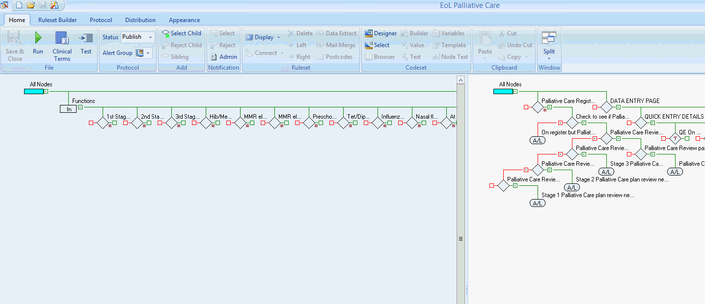 Using the split screen mode it is still possible to use the full functionality of the Pathway Developer Tool. You can also copy \ cut Rule Nodes from one pathway to another (Subject to the source and target pathways having the same Codesets)