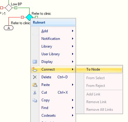 Connect To Node is used to connect a Rule Node to another, anywhere in a Pathway. This is useful when there are multiple rules in a single pathway that result in a single Outcome. Rather than replicating the same outcome (Rules), the developer connects all the Rules to the resulting Outcome. This makes Rules easier to maintain by avoiding duplication.