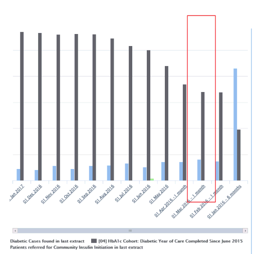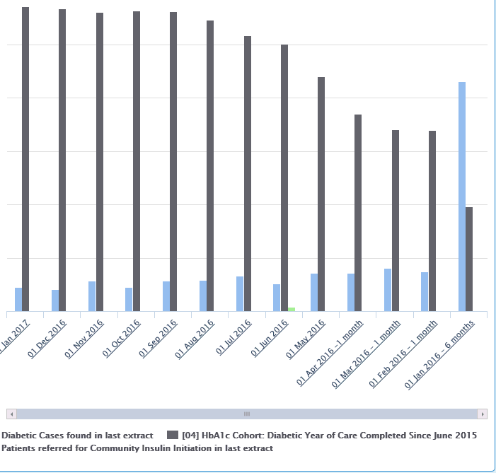 A Drill Down chart can display summaries of activity across practices and date ranges. When a user clicks on elements of the summary chart this will then drill down into the practice data making up that summary.