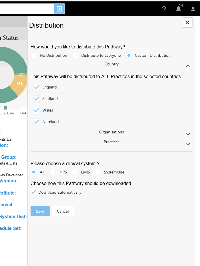 The Distribution settings control adding pathways across a combination of countries\ organisations and practices.