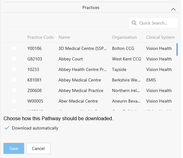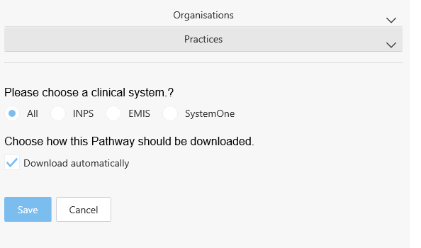 This setting makes the pathway available to all practices across all countries. The selection can be further refined by the clinical system.