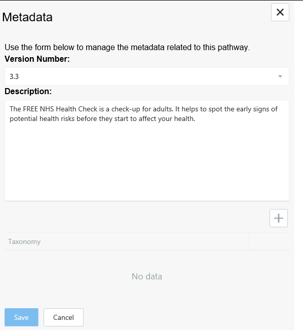 A pathway that has been designed to work in Vision Anywhere must have a metadata version number in order for it to be made available withing the Vision Anywhere application. A description of this pathway can also be added and Taxonomy information to make it searchable in a browser