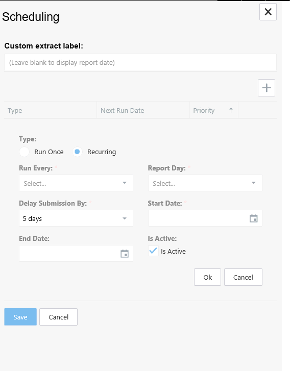 A Recurring schedule is used to generate rolling extracts. A Report Date can be set historically which is then used to extract the required data from practices. A Run Once schedule will retry every night to get data from any practices that have failed to upload. Once all practices have uploaded data, the Run Once schedule is complete and will not repeat.