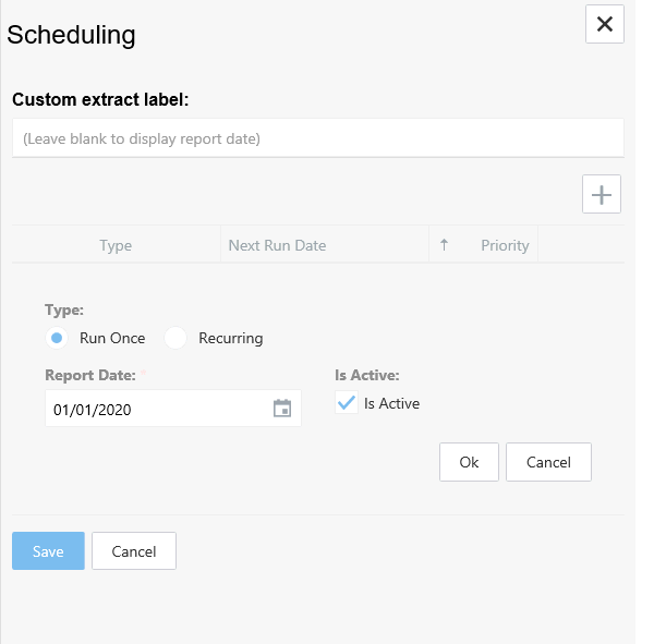 A Run Once schedule is used to generate historic extracts. A Report Date can be set historically which is then used to extract the required data from practices. A Run Once schedule will retry every night to get data from any practices that have failed to upload. Once all practices have uploaded data, the Run Once schedule is complete and will not repeat.
