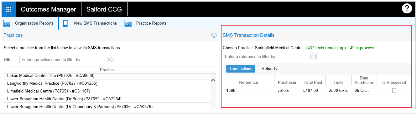 The Search Transactions feature allows you as an organisation to view SMS Transactions for a selected practice. This is in the form of Practice based purchase of SMS bundles and also where applicable an refunds.