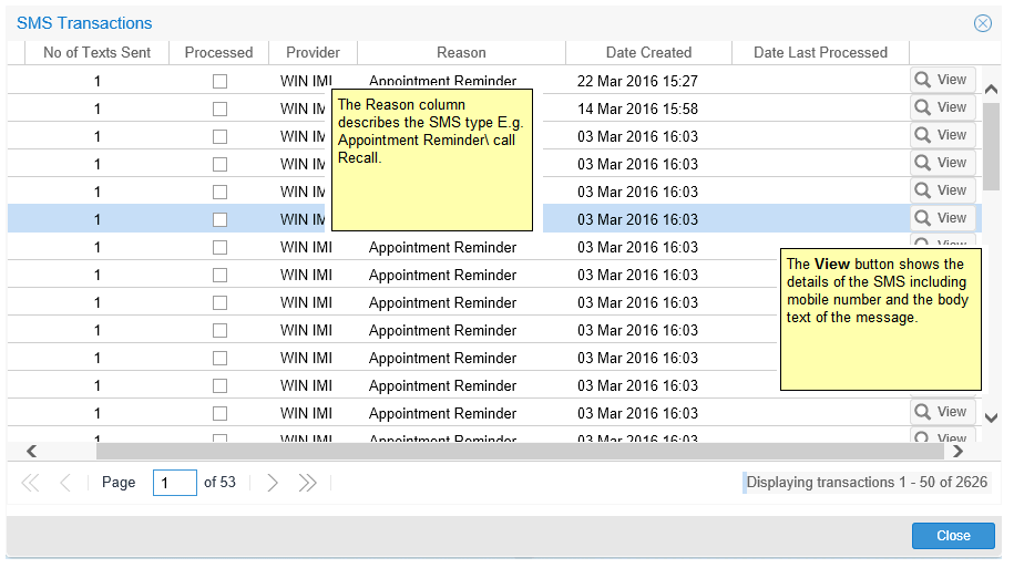 The Screen will display the SMS Transaction Details for that practice.