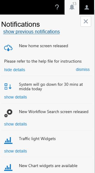 Notifications will display messages that have been sent to all users in your organisation. Personal notifications will also display here e.g. a Workflow Review is required. Outstanding notifications are displayed against the notifications icon.