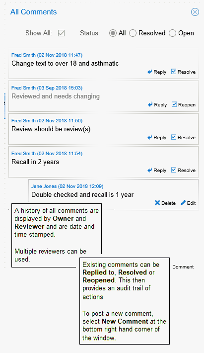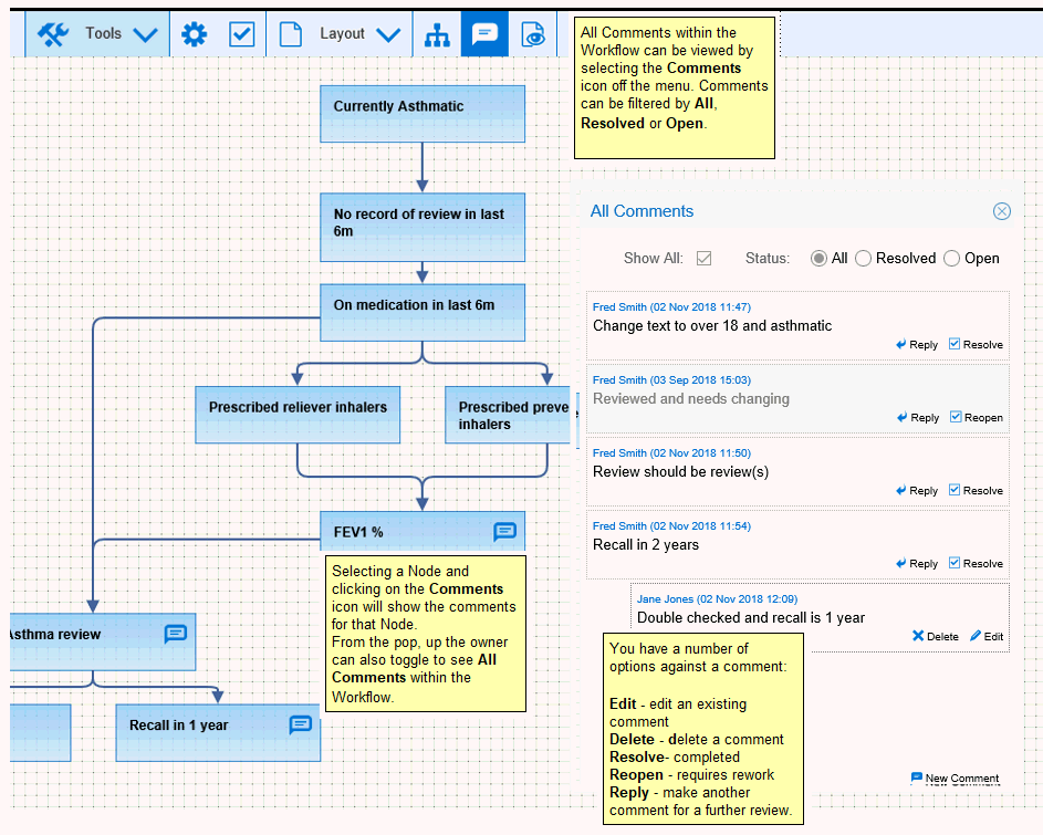 If a Workflow has been reviewed multiple times, comments will build up in the Node Comments window against each annotated node and will be date and time stamped. This is effectively discussing the change history of the relevant Nodes and\or Workflow.