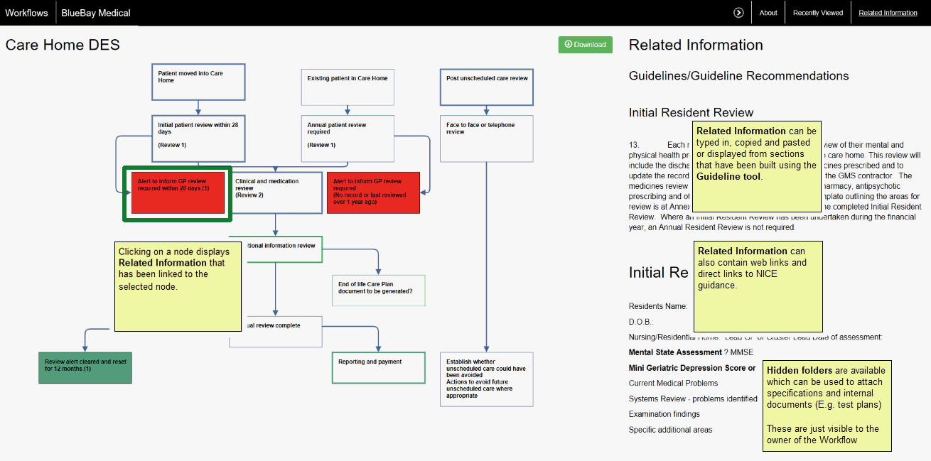 A user can select a node and further information embedded into that node can be displayed. Freetext, external URL links, NICE Resources, other links to other Workflows and sections from Guidelines created using the Guideline tool can be displayed.